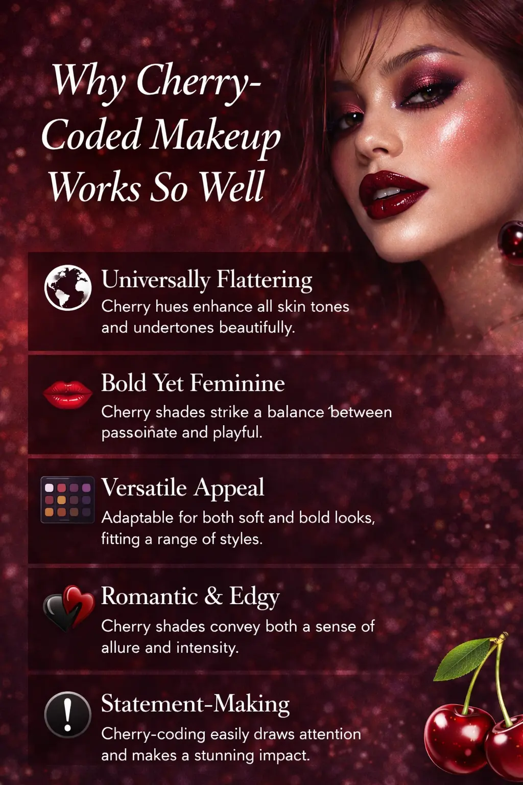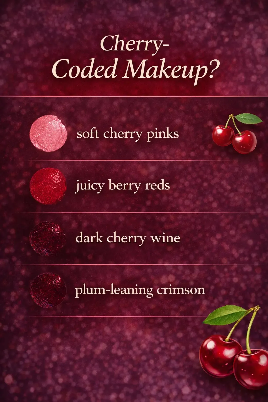 Whether you’re drawn to soft romantic cherry or dark dramatic wine tones, cherry-coded makeup lets you tell a story — your story.