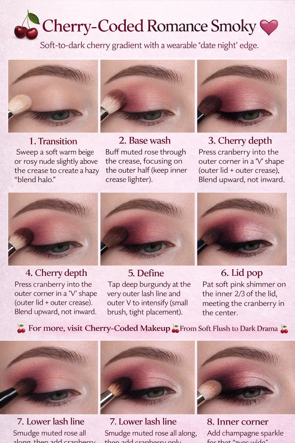 👉 For more shade pairing ideas and intensity levels, link this look to your post: Cherry-Coded Makeup: From Soft Flush to Dark Drama 🍒.