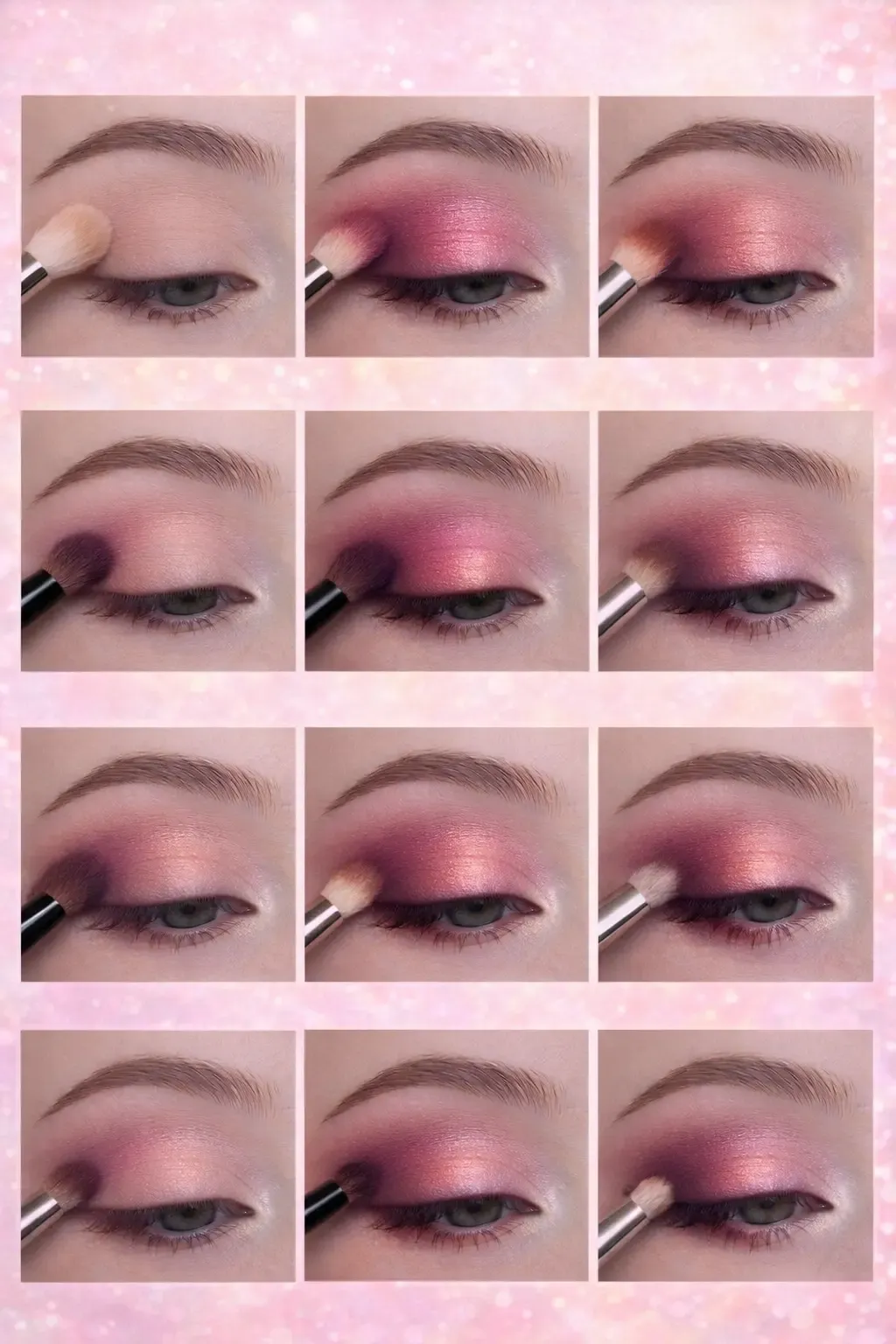- Lower lash line: Smudge baby pink all along; add rosy brown outer third.
